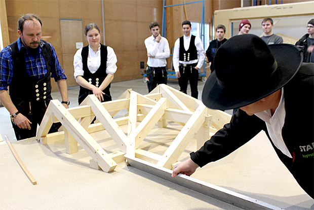 Dabei haben die Zimmererlehrlinge das Modell eines kniffeligen Dachstuhls nachgebaut. Am Montag begann die Woche mit der Aufgabenstellung sowie der Übergabe der umzusetzenden Pläne.