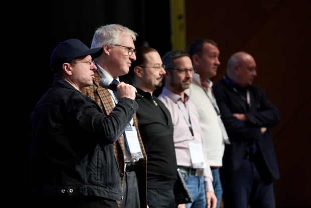 Zu Beginn des Barcamps bat Moderator Christoph Krause (ganz links) alle Teilnehmer mit einem Thema oder einer Frage nach vorne zu kommen.